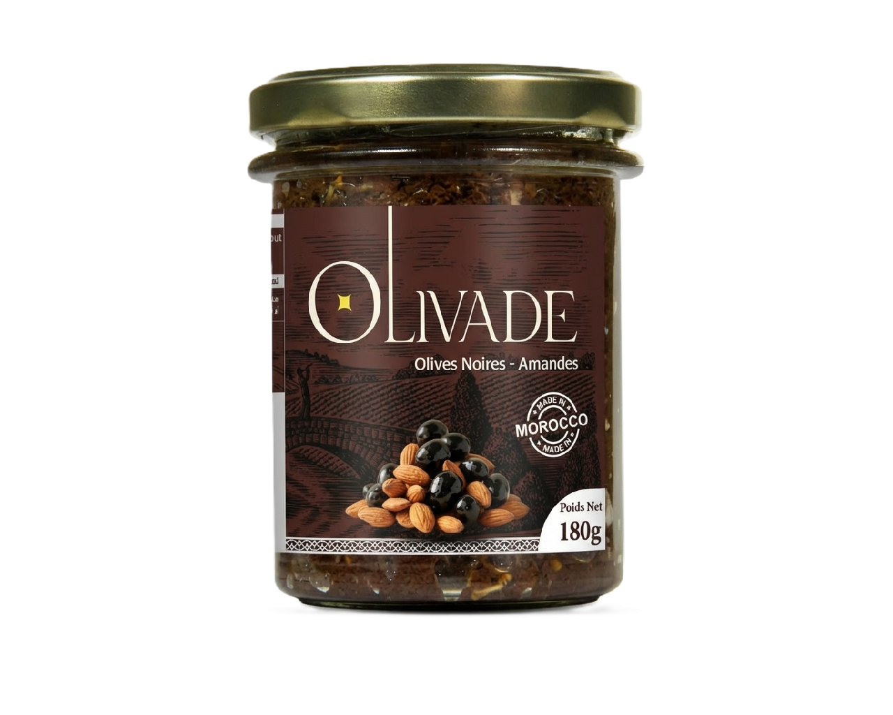 Préparée avec de la pâte d’olives noires beldis (naturellement maturées), des amandes grillées, de l’huile d’olive extra vierge, de l’ail et jus de citron.