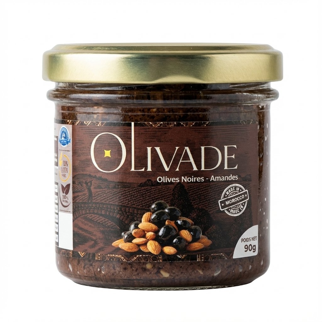 Préparée avec de la pâte d’olives noires beldis (naturellement maturées), des amandes grillées, de l’huile d’olive extra vierge, de l’ail et jus de citron.