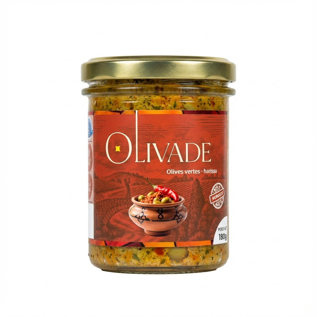Préparée avec de la pâte d’olives verte beldis (naturellement maturées), harissa, de l’huile d’olive extra vierge, de l’ail, du jus de citron et persil.